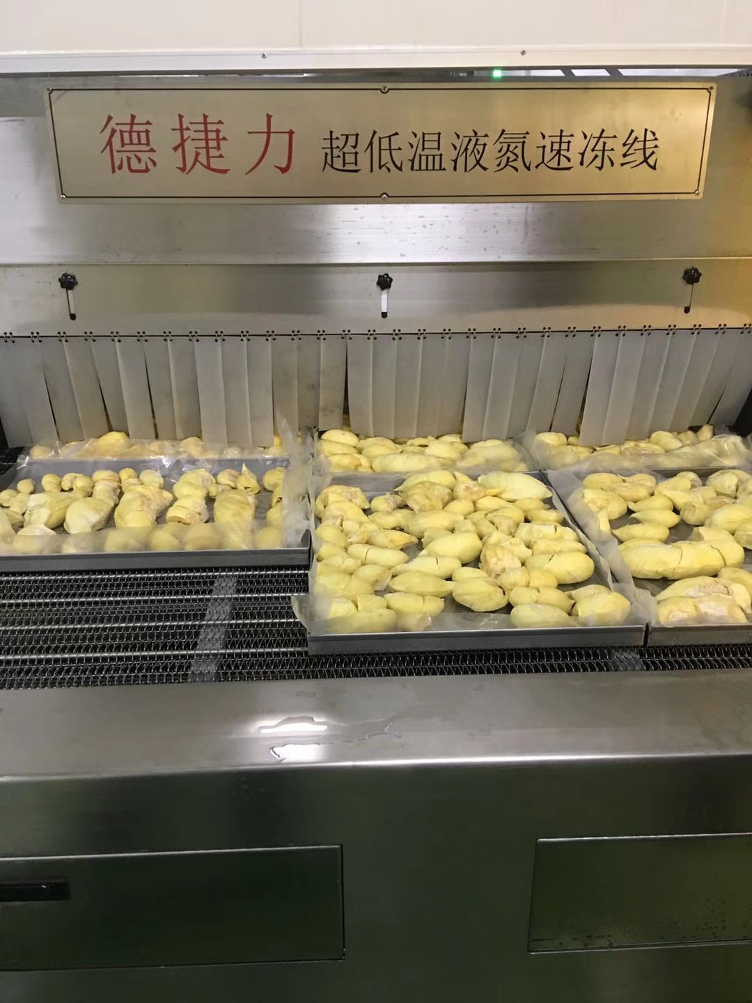 其中,液氮速凍機(jī)能夠在非常短時(shí)間內(nèi),把速凍的榴蓮中心溫度凍達(dá)到-18℃,從而達(dá)到減少水分及營養(yǎng)流失,留住營養(yǎng)價(jià)值,保持榴蓮的風(fēng)味和口感的效果。