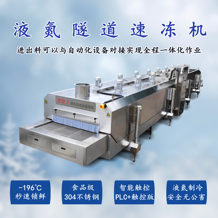 德捷力預(yù)制菜液氮速凍機(jī)低溫極限溫度低達(dá)-196°C,當(dāng)預(yù)凍品接觸超低溫速凍設(shè)備后迅速氣化,就能瞬間帶走凍品表面熱量進(jìn)行熱交換。以秒速的時(shí)間通過冰晶生長帶,在凍品組織中行成均勻分布的極小結(jié)晶。瞬間鎖住凍品水分,幾乎達(dá)到了無損失,從而保持了食品的原色、原味、原質(zhì)和原形。