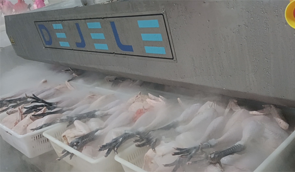 德捷力液氮速凍機使用-196℃的液氮作為冷卻介質(zhì),使雞肉在極短時間內(nèi)迅速降溫到冰點以下。這一過程通過以下步驟實現(xiàn):